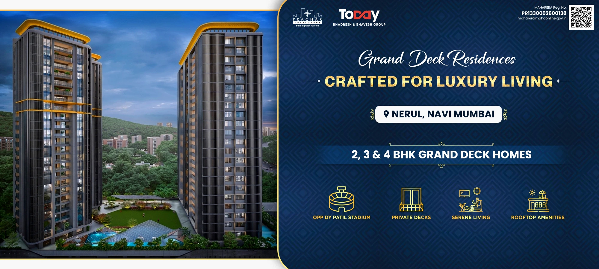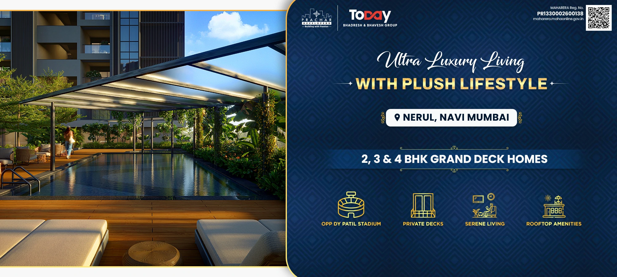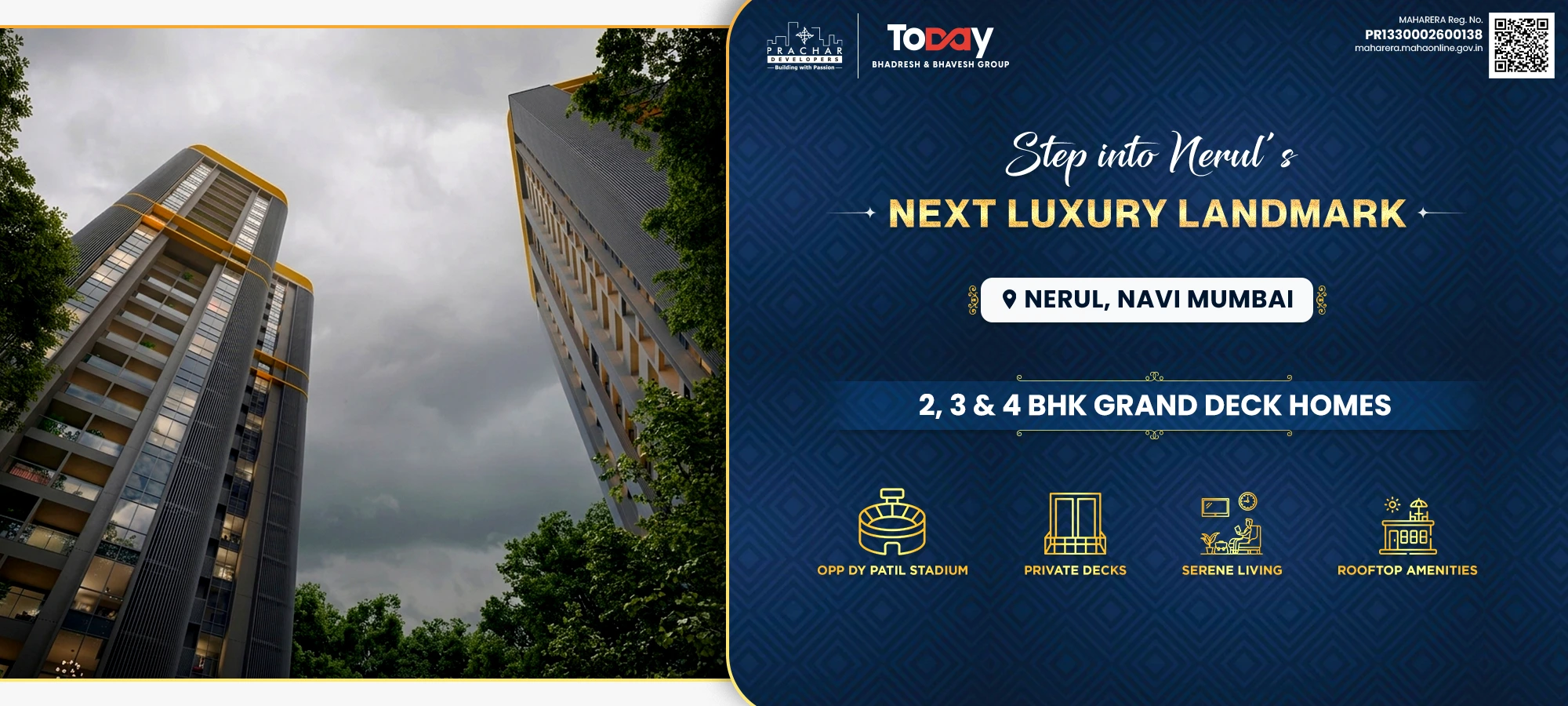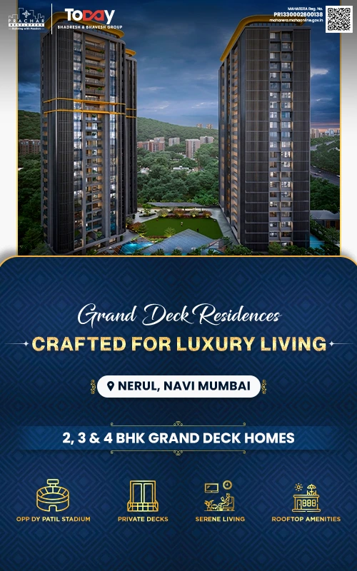 Welcome to Nova Vista, a premium residential landmark in the heart of Nerul, Navi Mumbai , brought to you by the trusted legacy of Prachar Developers and the Today Group. Strategically positioned with seamless connectivity to Palm Beach Road and the Sion-Panvel Expressway , Nova Vista offers thoughtfully designed, luxury 2, 3, and 4 BHK homes tailored for urban professionals and modern families. Designed for those who prefer the quieter side of luxury , this exclusive gated community features over 30 signature experiences, including integrated wellness zones and premium rooftop amenities. Backed by over two decades of real estate excellence , Nova Vista seamlessly converges location, lifestyle, and high capital appreciation potential, making it the ultimate destination for your dream home or next smart investment.